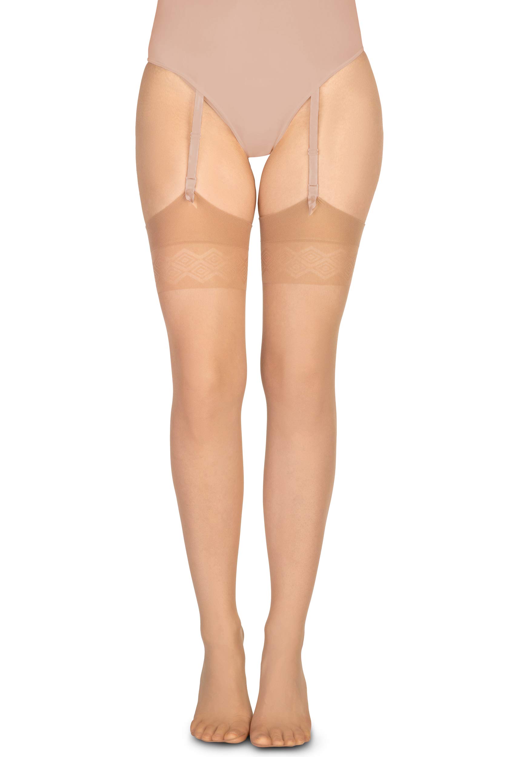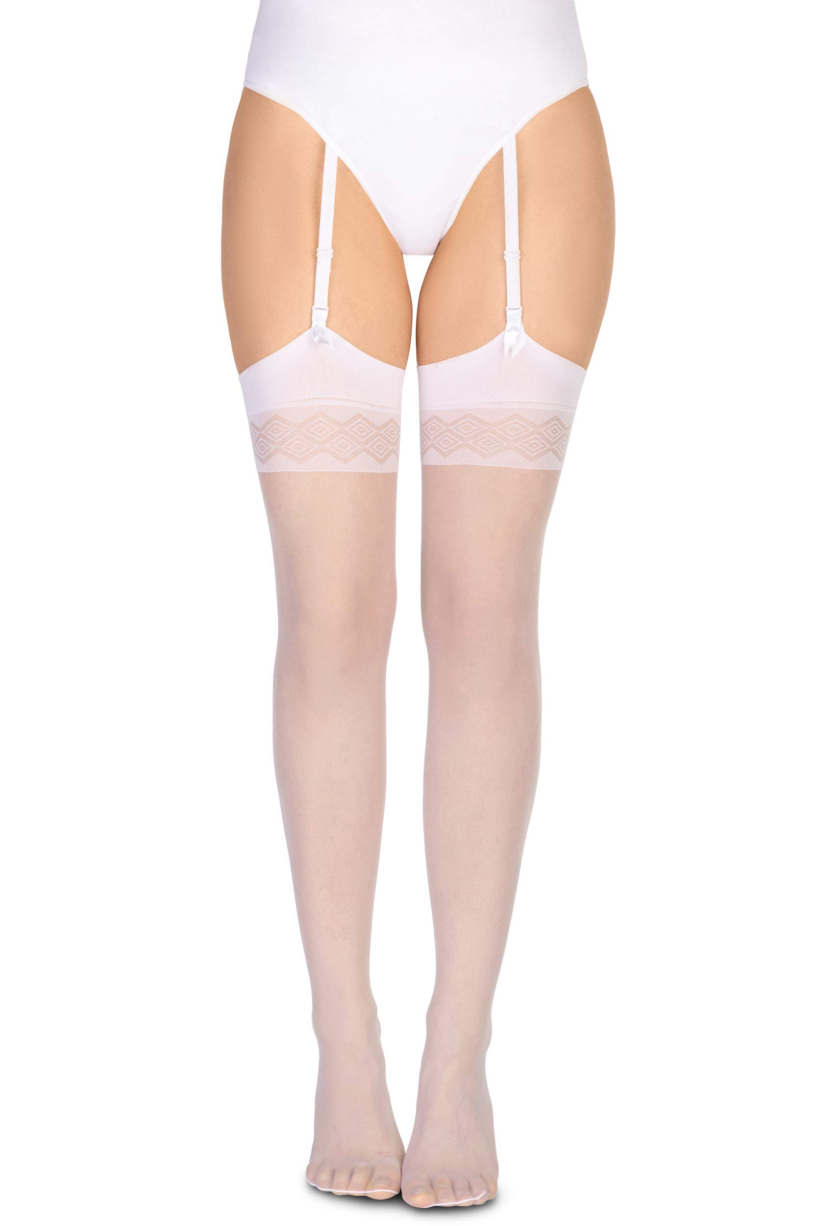 Klasické tenké punčochy s přídavkem Lycry. Vyrobeno bez silikonu - k nošení pouze s bederním pásem. Zakončeno geometrickým vzorem na stehně. Doporučujeme především ženám, které mají rády klasické páskové punčochy a ženy alergickým na silikon. V punčochách Noel se bude každá žena cítit smyslně a elegantně.